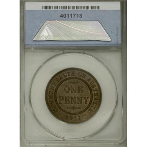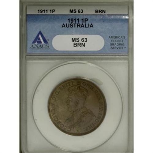 <B>George V Penny 1911,</B></I> KM23, MS63 Brown ANACS. A dash of original mint-red with only a few light marks.<BR><BR><b>Shipping:</b> Coins & Currency (<a target="_blank" href="http://www.heritageauctions.com/common/shipping.php">view shipping information</a>)