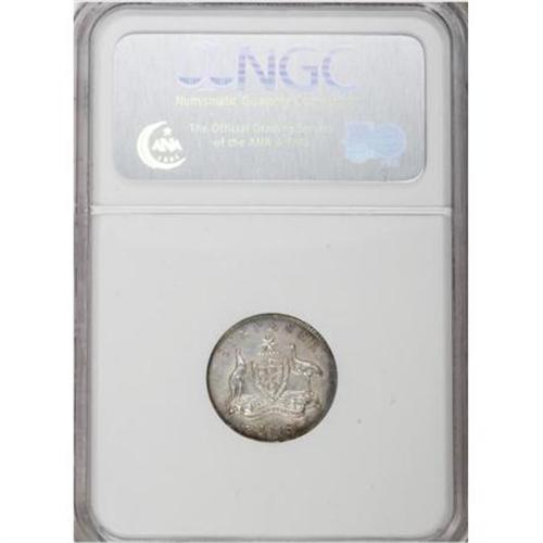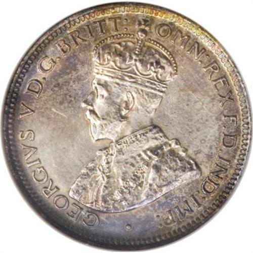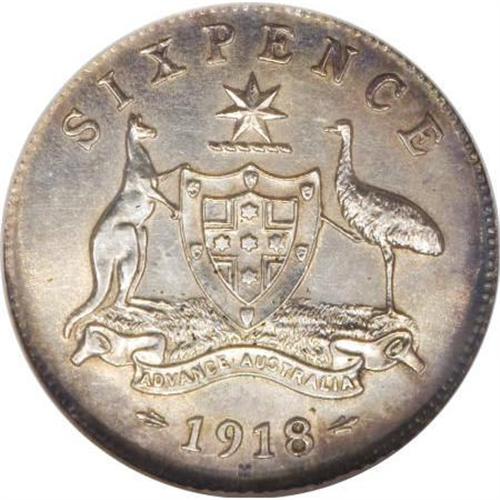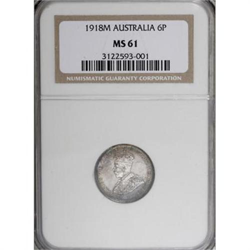 <B>George V Sixpence 1918M,</B></I> KM25, MS61 NGC. Bright and lustrous with a sharp strike and blue peripheral toning. <BR><BR><b>Shipping:</b> Coins & Currency (<a target="_blank" href="http://www.heritageauctions.com/common/shipping.php">view shipping information</a>)