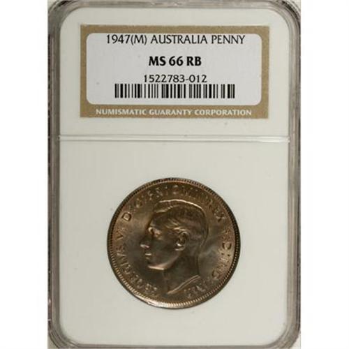 <B>George VI Penny 1947 (M), </B></I> KM36, MS66 Red & Brown NGC, a superb coin with virtually full mint brilliance and attractive glossy surfaces.<BR><BR><b>Shipping:</b> Coins & Currency (<a target="_blank" href="http://www.heritageauctions.com/common/shipping.php">view shipping information</a>)