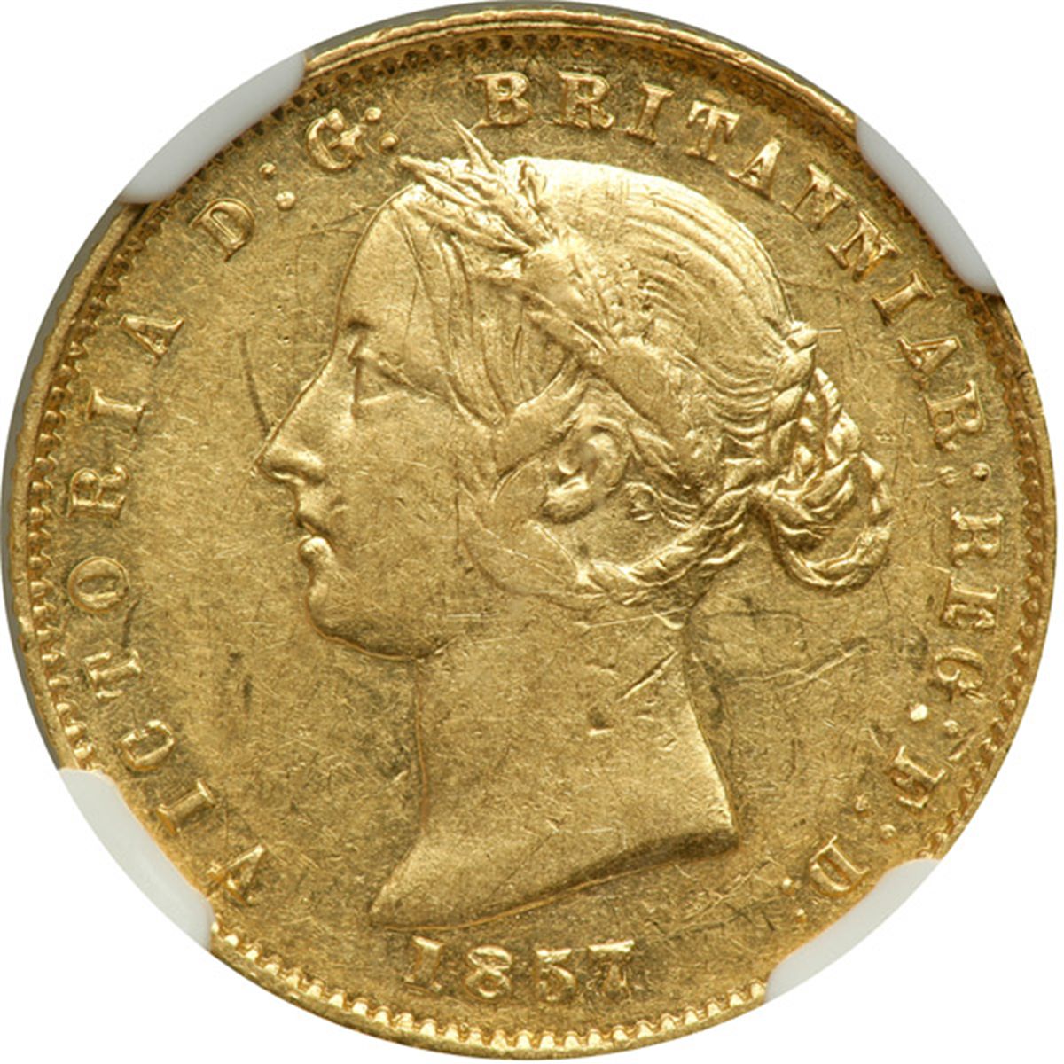 Australia. Half Sovereign, 1857 (Sydney). Fr-9a; KM-3. Victoria. Filleted young head left. Reverse: Crown above Australia within wreath. Appears to be a lint mark in obverse field. Consignor indicates rare mint error with a 5 under the 7 in date. Only 4 exist. We strongly recommend careful study. NGC graded EF-45.