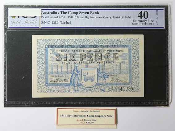 Australia, Hay Internment Camp, Sixpence, Epstein/Stahl, 1941, C/41289, PCGS Extremely Fine 40 Details, Washed, together with ex. Rare Coin Company ticket, a scarce note