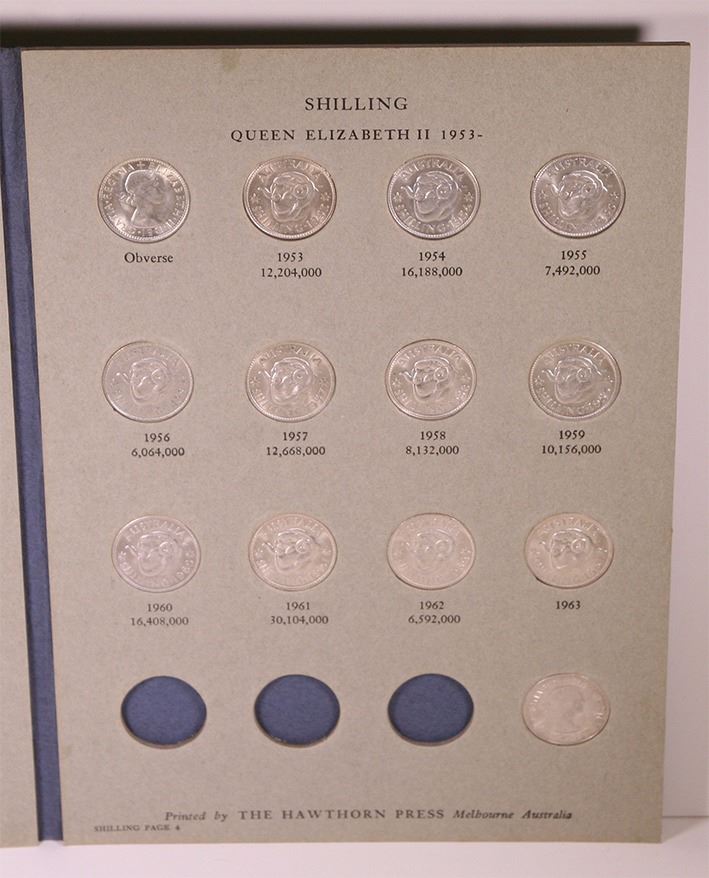 Shilling Set, 1910-63, complete except for 1933, housed in as-new Hawthorn press-in album, KEVII G-VG, KGV G-F (1935 spotted), KGVI VG-gEF (1941 dark toned), QEII EF-BU, obverses included, above average set with some nice pickings, amongst the later dates (54 coins)