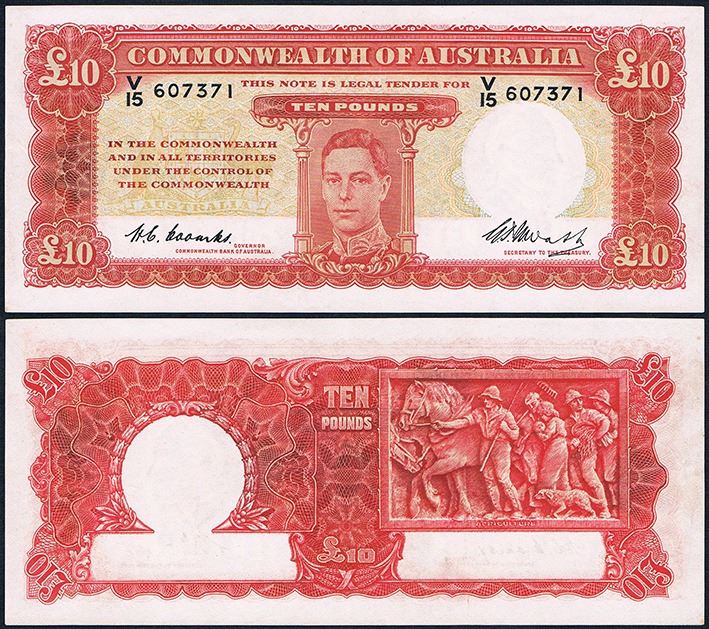 Australia, KGI, Ten Pounds, Coombs/Watt, 1949, (R.60F), First Prefix, V15/607371, gEF