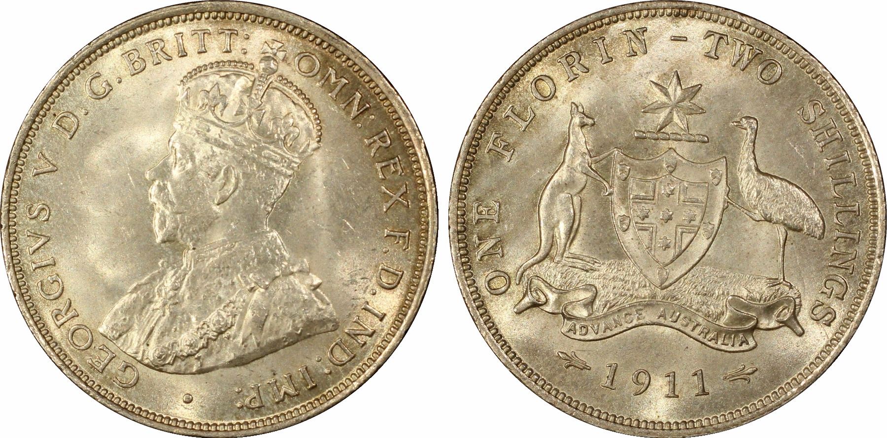 Florin, 1911, PCGS MS65, glorious original lustre with golden hues and blue highlights in the legends, superb example of this first year type (pop. 3/0)