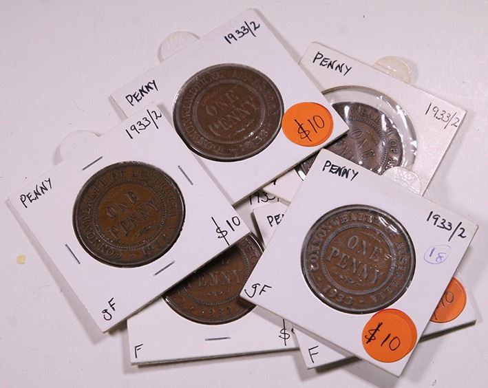 Penny, 1933/2, Overdate, graded as fine - good fine, select group (6 coins)