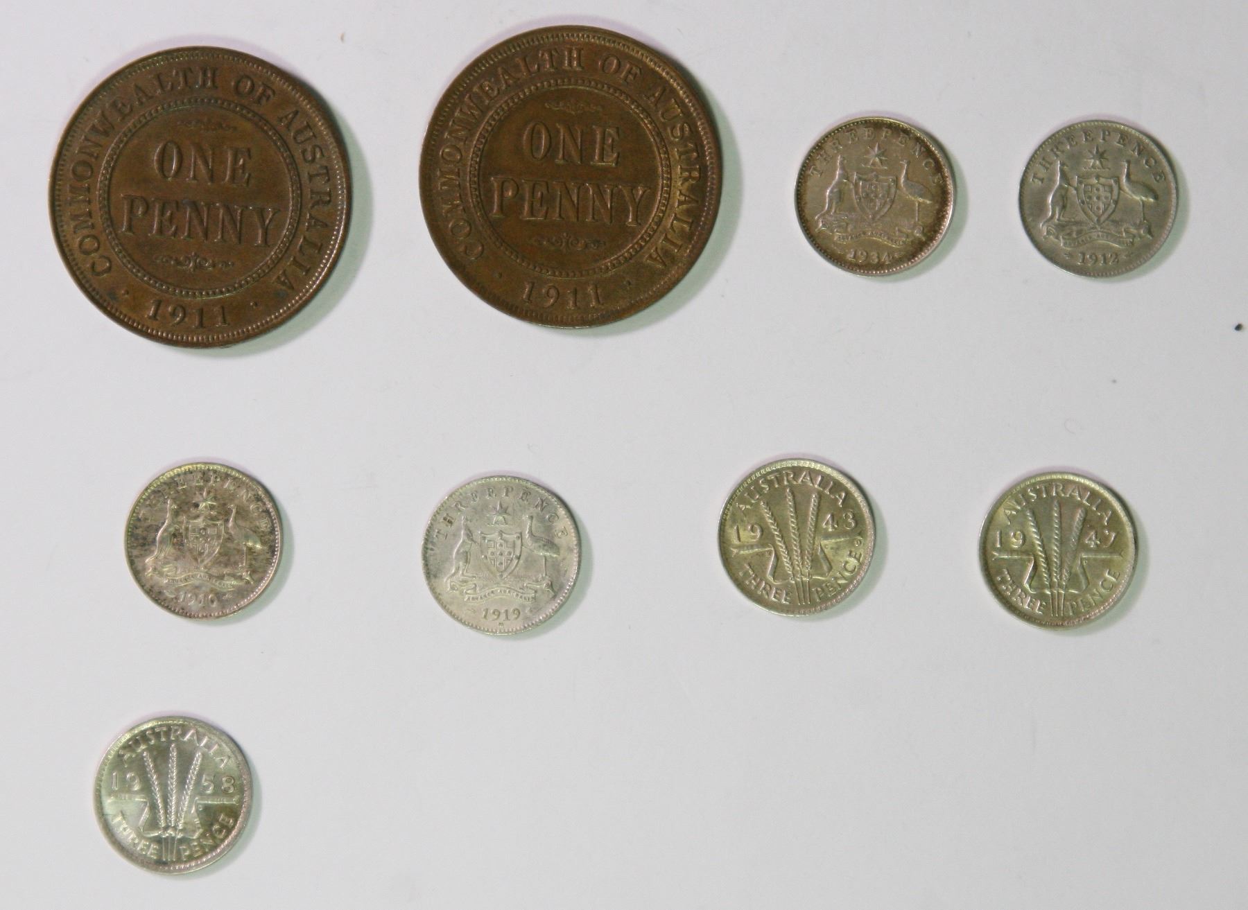 Penny, 1911, good very fine and almost extremely fine, one with graffiti, the other with green deposits; together with Threepence, 1910, 1911, 1912, 1919, 1943D, 1947, 1958, most coins cleaned at some stage, graded as very fine - almost uncirculated (9 coins)