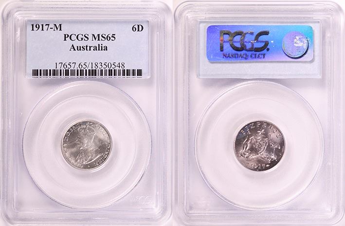 Australia, KGV, Sixpence 1917-M, PCGS MS65