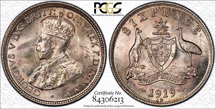 Australia, KGV, Sixpence, 1919-M, PCGS MS 65