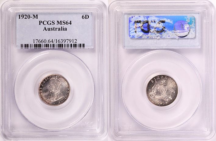 Australia, KGV, Sixpence 1920-M, PCGS MS64