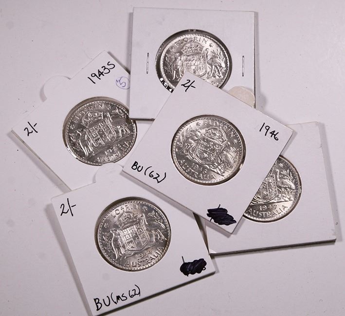 Australia, KGVI, Florin, 1943-S, 1944, 1946, 1947 (2), the first choice uncirculated, the second and third brilliant uncirculated, the last two uncirculated (5 coins)