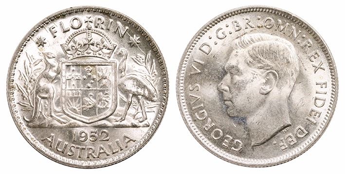 Florin, 1952, flashy brilliant lustre with mirror-like areas of die polish on obverse, scarcer, graded as brilliant uncirculated