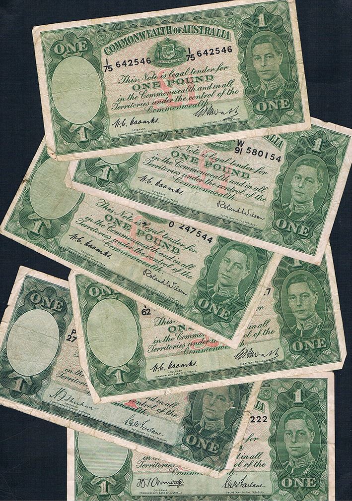 One Pound, Sheehan/McFarlane, 1938; Armitage/McFarlane, dark green, 1942; Coombs/Watt, 1949; Coombs/Wilson, 1952 (3), the first with edge nick, else good fine, the second with multiple edge nicks and tear to right margin, almost very good, the rest fine - good fine (6 notes)