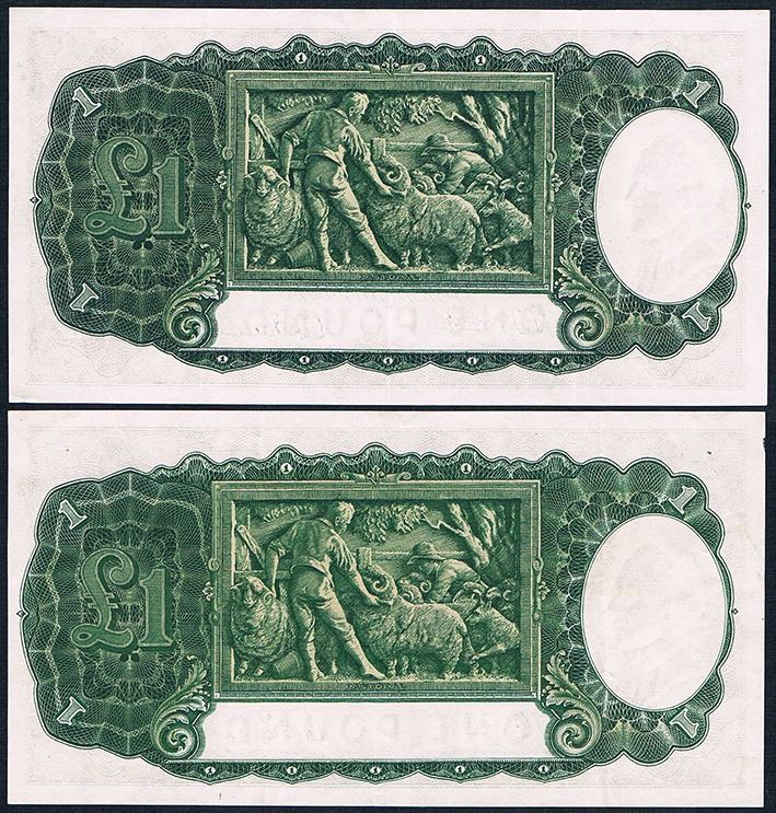 One Pound, Armitage/McFarlane, 1942 (30a), both with four vertical pay-packet folds, good colour and body to paper, graded as almost extremely fine (2 notes)