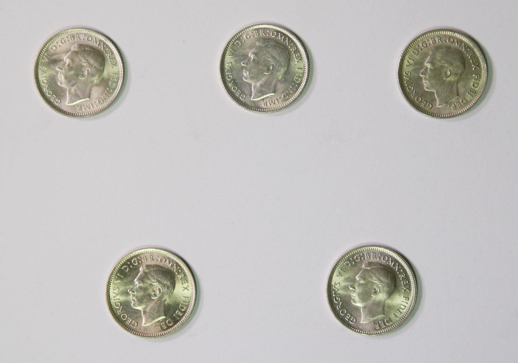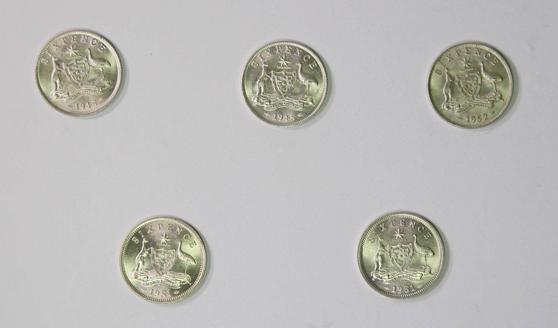 Sixpence, 1945 (2) good extremely fine and uncirculated; 1951-PL choice uncirculated (2), 1952 almost extremely fine (5 coins)