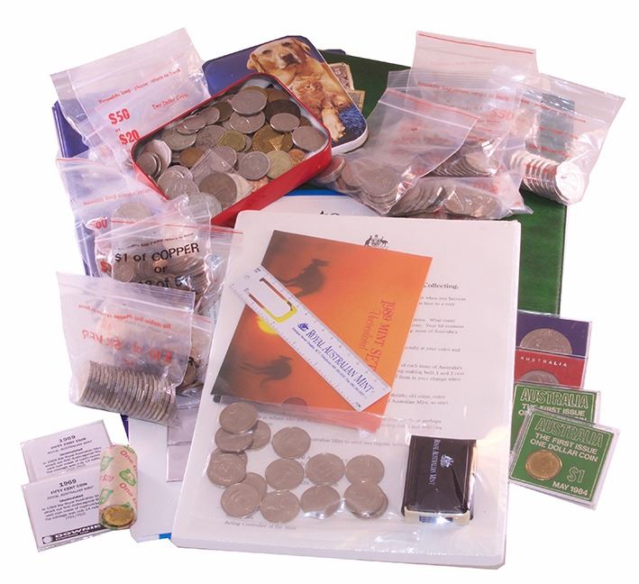Royal Australian Mint collectors starter kit, including 1989 Uncirculated set; together with Uncirculated cased Fifty Cents, 1969 (2); 1970 Cook; One Dollar 1984 (2) and Uncirculated One Dollar Roll, 2005; plus miscellaneous loose Average Circ - Uncirculated One Cent to Two Dollar coins including 1966 Round Fifty, some housed in two folders, others in bags and a vintage tin of mixed World & Australian coins, a few silver. Note: (approx. $145 face value of loose coinage) (Lot)