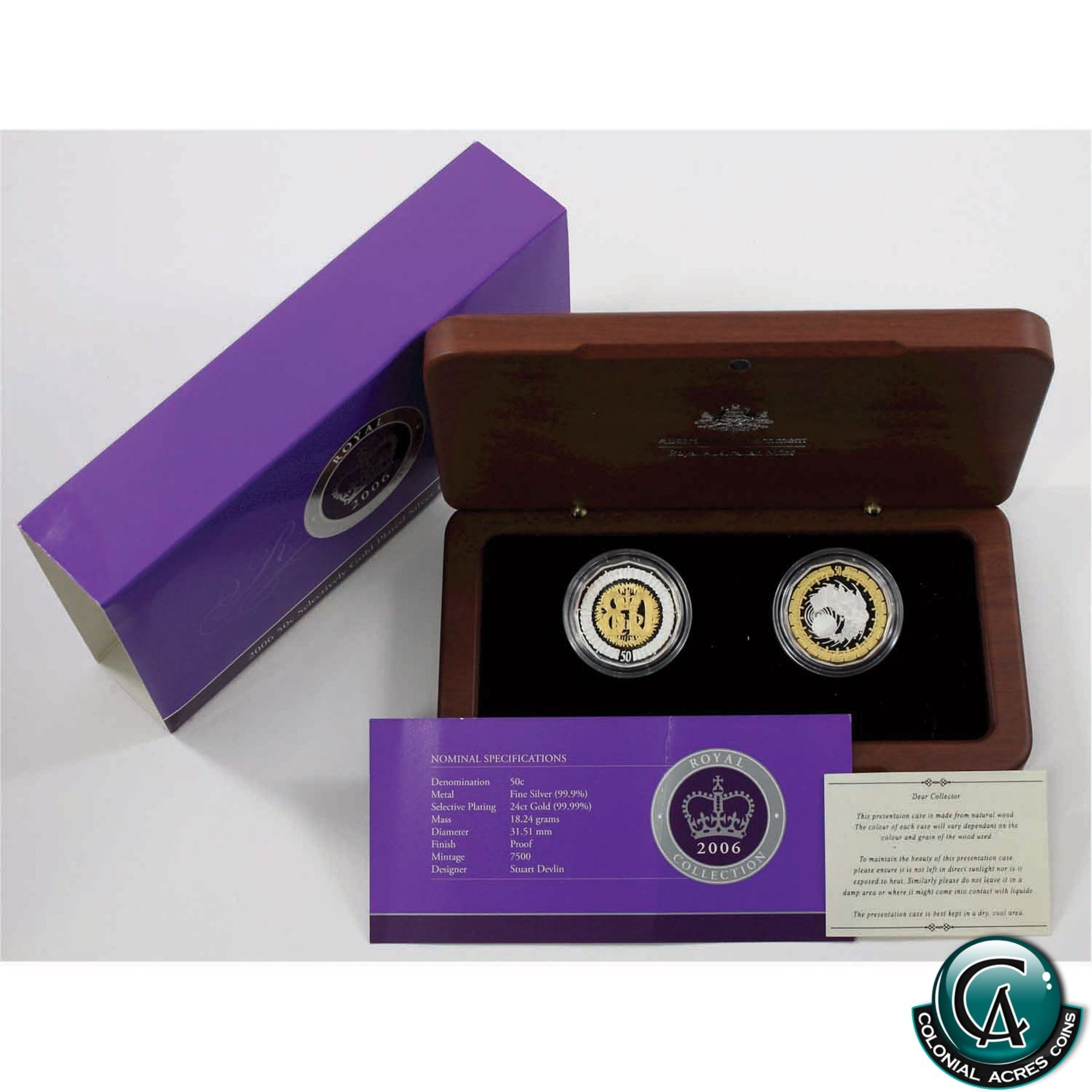 Australia Mint 2006 50-cent Selective Gold Plating Royal Collection Silver Proof 2-coin Set in Wooden Display Case (coins are lightly toned on the edge in one spot & COA is bent). Tax Exempt