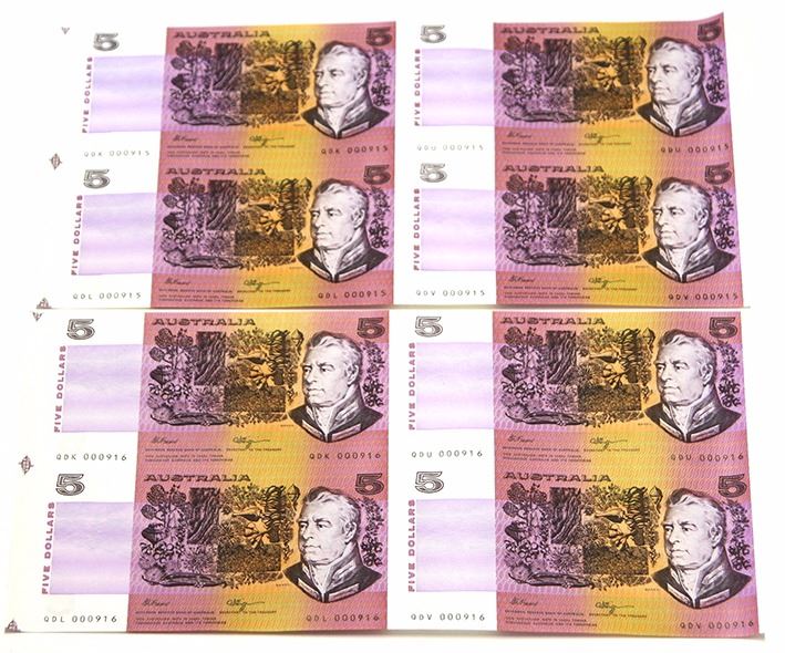 Australia, NPA, Five Dollars, Fraser/Higgins, 1990, Uncut Block of Four