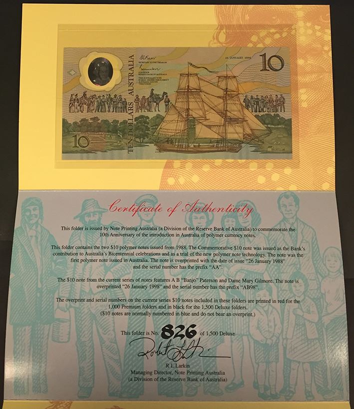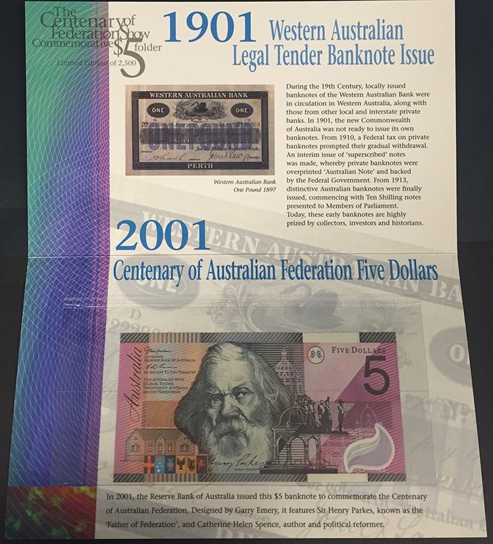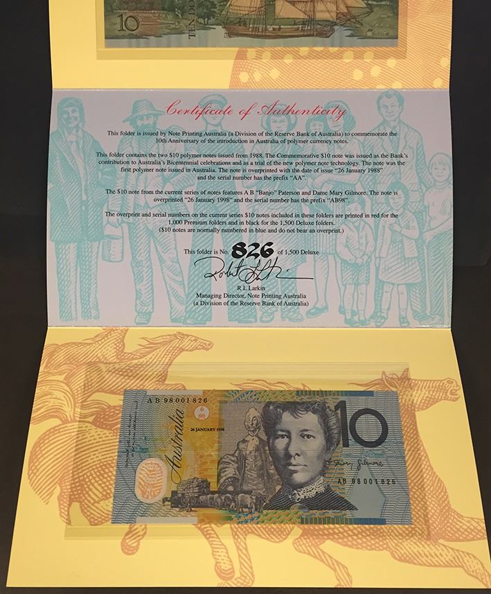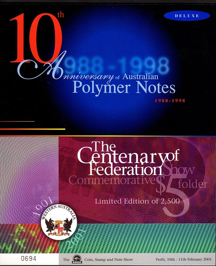 Five Dollars, 2001, Centenary of Federation, ANDA Perth Fair Issue; Ten Dollars, 1998, 10th Anniv. of Polymer Notes Deluxe. (2)