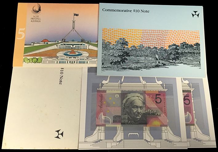 Five Dollars, 1992, Two notes standard folder, 2001, Centenary of Federation (2); Ten Dollars, 1988, blue folder (2), some wear to the outer covers, useful lot. (5)