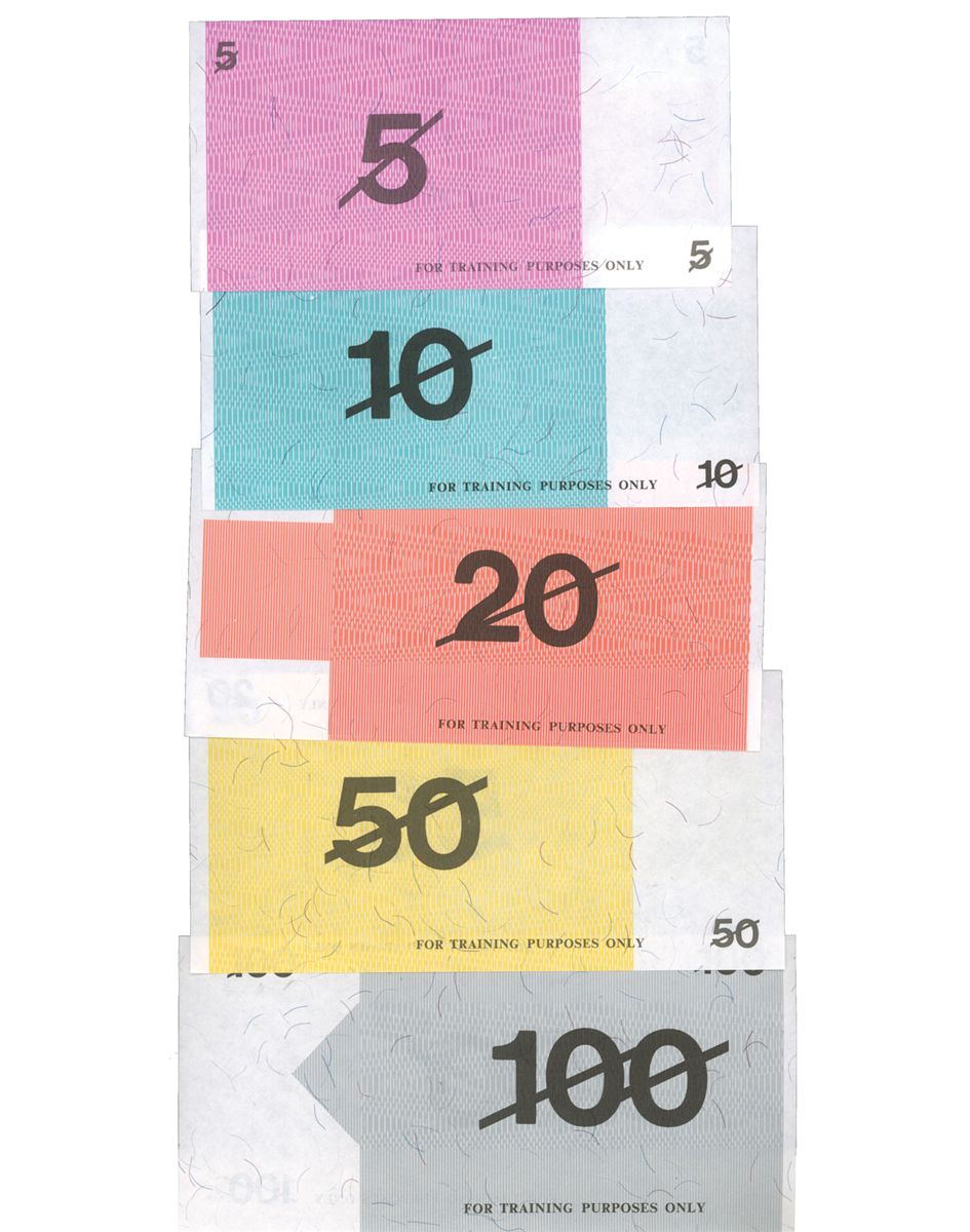 Used to assist in staff training. Comprises $5, $10, $20, $50 and $100 in colours matching the paper decimals. UNC