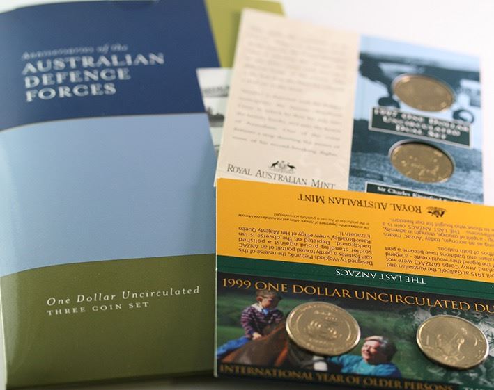 Uncirculated One Dollars, 1997 Kingsford Smith Twin Pack, 1999 ANZAC & Older Persons Twin Pack, 2001 Army, Navy, Air Force Defence Forces Pack (7 coins, 3 items)