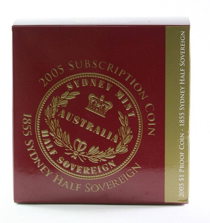Proof One Dollar, 1855 Sydney Half Sovereign, gold plated, 1.945 oz silver, in case as issued by RAM with certificate