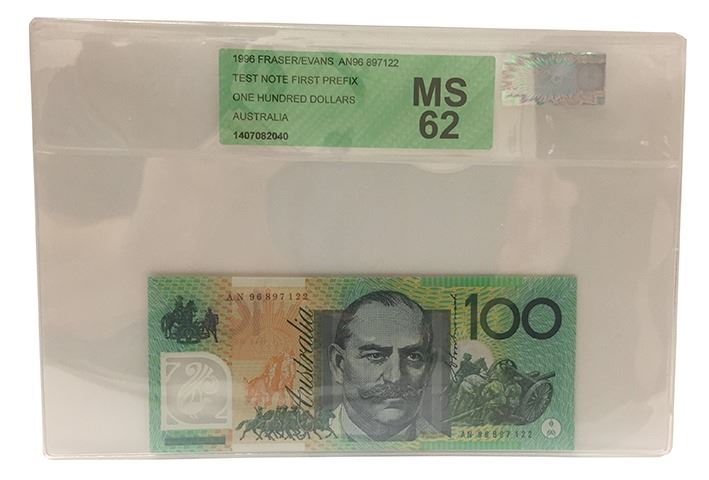 One Hundred Dollars, Fraser/Evans, 1996, AN96897122, Test Note, graded as uncirculated and slabbed in APCGS holder graded MS62 (See previous lot for consecutive numbered note)