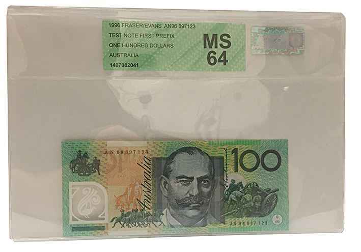 One Hundred Dollars, Fraser/Evans, 1996, AN96897123, Test Note, graded as uncirculated and slabbed in APCGS holder graded MS64 (See previous lot for consecutive numbered note)