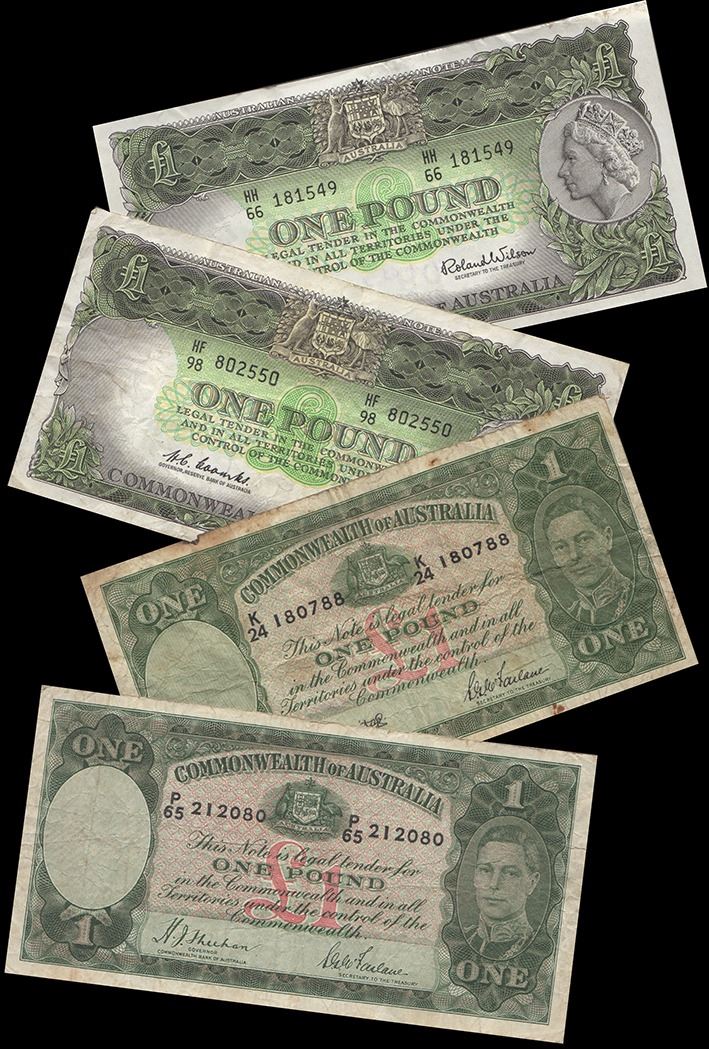 One Pound, Sheehan/McFarlane, 1938, Armitage/McFarlane, 1942, Coombs/Wilson Reserve, 1960 (2) (R.29, 30a, 34a, 34b), graded as very good - good fine, the second with rust stains and nicks, last with pen notation to reverse (4 notes)