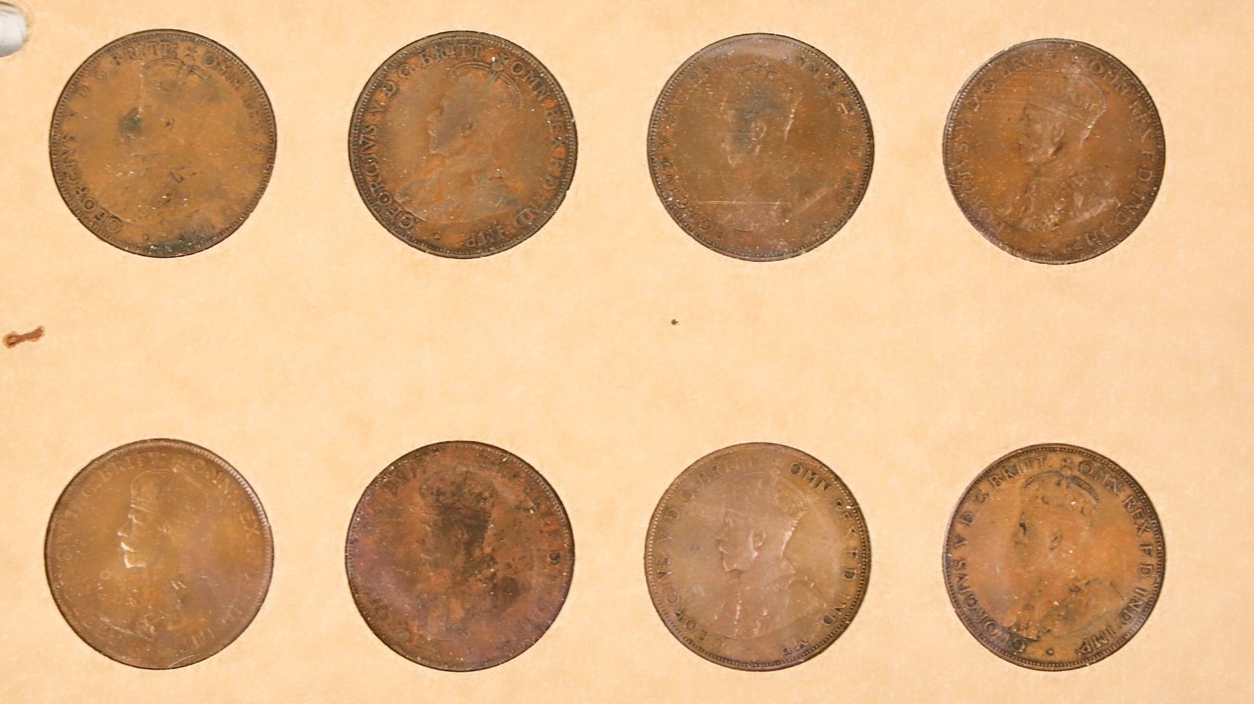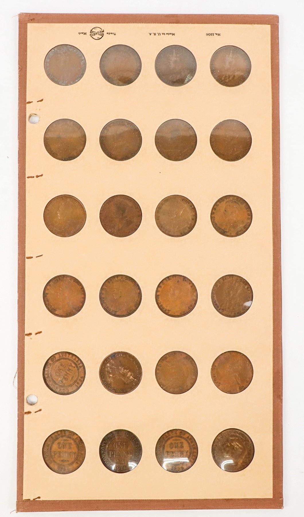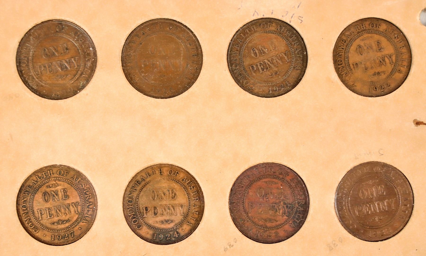 Twenty four large Australian one penny coppers, mounted in a Meghrig coin album page. Dates range from 1911-1941. Coins are VG-EF condition overall.