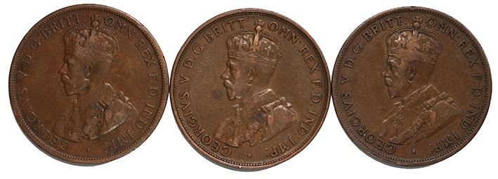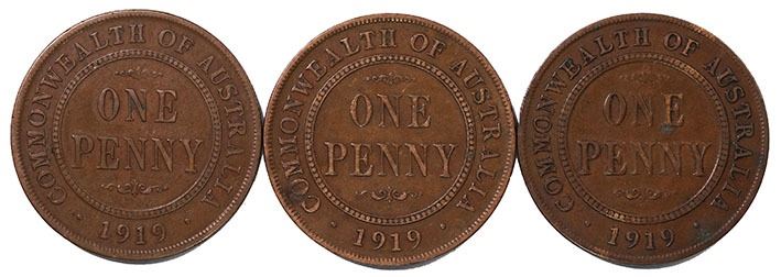 1919 plain, 1919 dot below, 1919 double dot. The double dot especially scarce, fine (3 coins)
