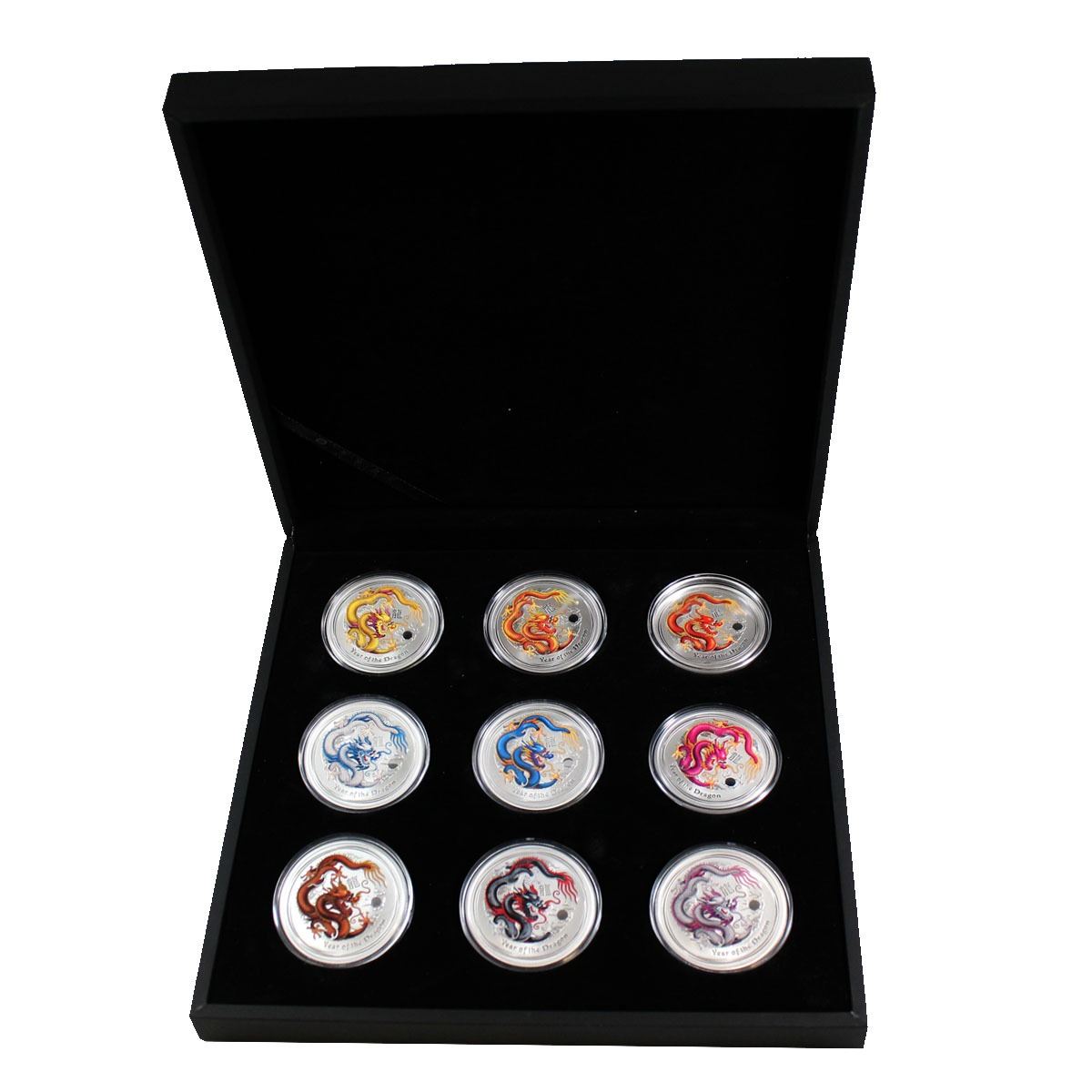 Australia; Perth Mint 2012 Australia Year of the Dragon 9-coin 1oz Fine Silver Colourized Set. This set is the Chinese version and comes with a different deluxe display box and COA (the display box is lightly tattered & some capsules are scuffed). TAX Exempt