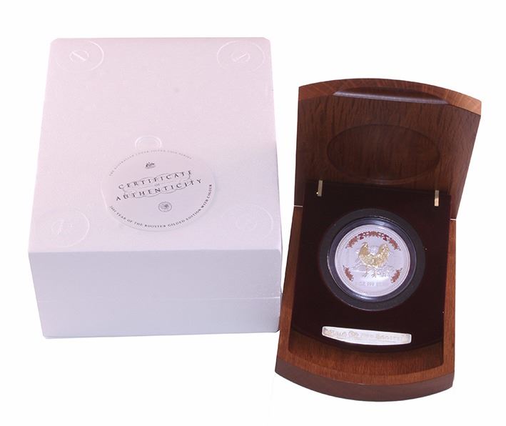 Perth Mint, 5oz Silver Gilded & Coloured Finish, Year of the Rooster, 2005, in original wooden Jarrah case, an attractive issue!