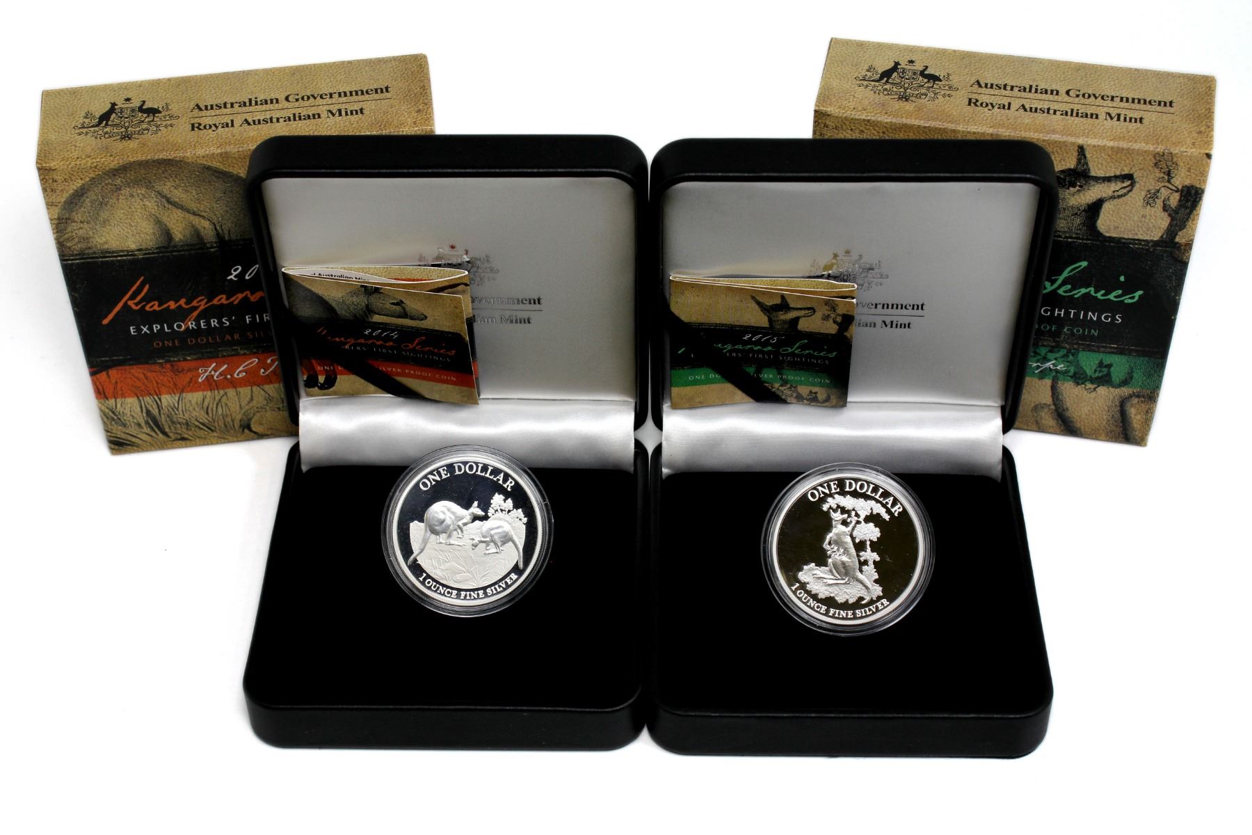 Australia- Perth Mint Issue: 2014 & 2015 Australia Explorer's First Sightings Kangaroo Series 1oz Proof Fine Silver Coins. Mintage of 10,000 per coin. 2pcs (TAX Exempt)