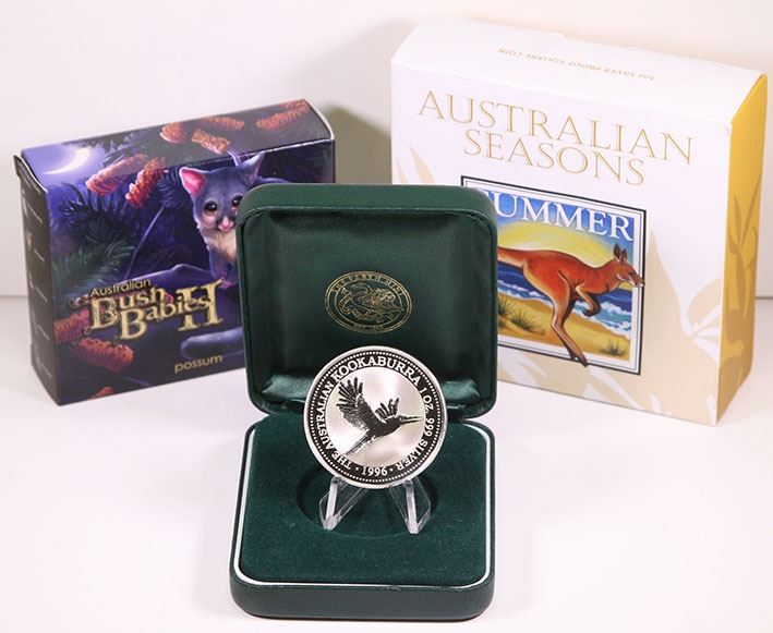 Perth Mint, Specimen silver 1oz Kookaburra, 1996; Bush Babies II, Possum, 2013; Australian Seasons, Summer, 2013 (3 coins)