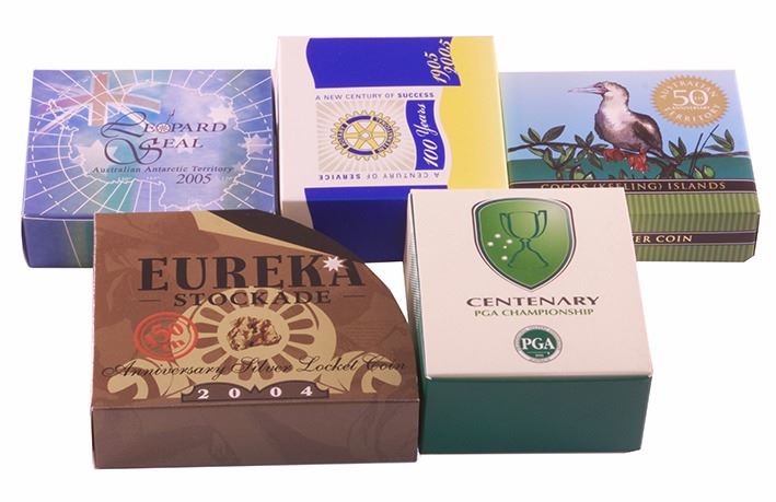 Perth Mint Proof 1oz Silver Dollar Issues, 2004 Eureka Stockade, 2005 Antarctic, Leopard Seal, 2005 Cocos Keeling, 2005 Rotary Centenary, 2005 PGA Championship (5 coins)