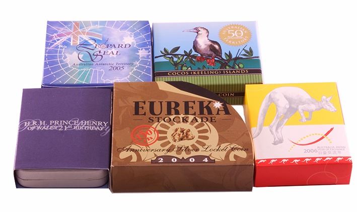 Perth Mint Proof 1oz Silver Dollar Issues, 2004 Eureka Stockade, 2005 Antarctic, Leopard Seal, 2005 Cocos Keeling, 2005 Prince Henry Birthday, 2006 Japan Exchange (5 coins)