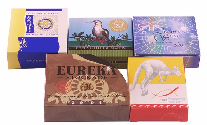 Perth Mint Proof 1oz Silver Dollar Issues, 2004 Eureka Stockade, 2005 Antarctic, Leopard Seal, 2005 Cocos Keeling, 2005 Rotary Centenary, 2006 Japan Exchange (5 coins)
