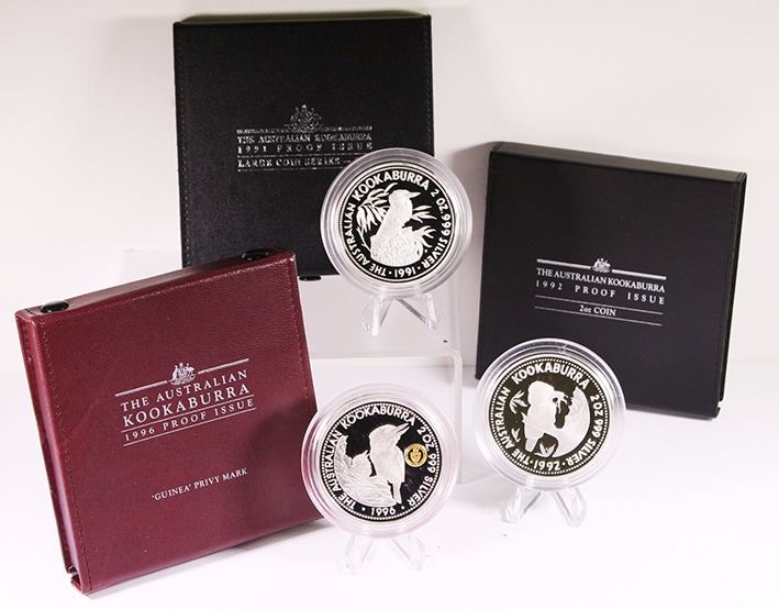 Perth Mint, Proof 2oz Silver Kookaburra, 1991, 1992, 1996 Guinea privy, in original case of issue with certificate (3 coins)
