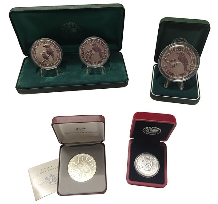 Specimen 2oz silver Kookaburra, 2000, Specimen 1oz silver Kookaburra, 1999 P100 privy mark, 2000 (pair), Specimen 10z silver Kangaroo, 2000; plus Specimen 1/2oz silver, 2000, Lunar Series, Dragon (5 coins, 4 items)
