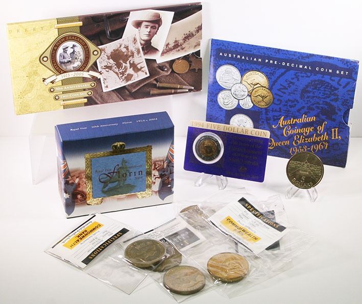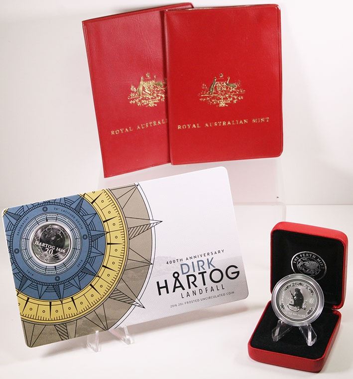 Australian Coinage of QEII, 1953-64 Coin Set; Silver Proof Fifty Cents, Lunar Year of the Monkey, 2004; Silver Proof One Dollar, Royal Visit 50th Anniversary Florin, 2004; Uncirculated Five Dollar (6), 1988, Enfranchisement of Women, 1994 Uncirculated Coin Sets, 1981 & 1983; Uncirculated One Dollar, ANZAC 90th Anniversary Two Coin Set, 2005; Uncirculated Twenty Cents, 400th Anniversary Dirk Hartog Landfall, 2016