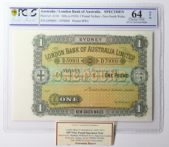 Australia, Pre Federation, London Bank of Australia Ltd, One Pound Specimen Note, 1897, PCGS Choice Unc 64 OPQ, together with ex. Rare Coin Company ticket, a rare and attractive note