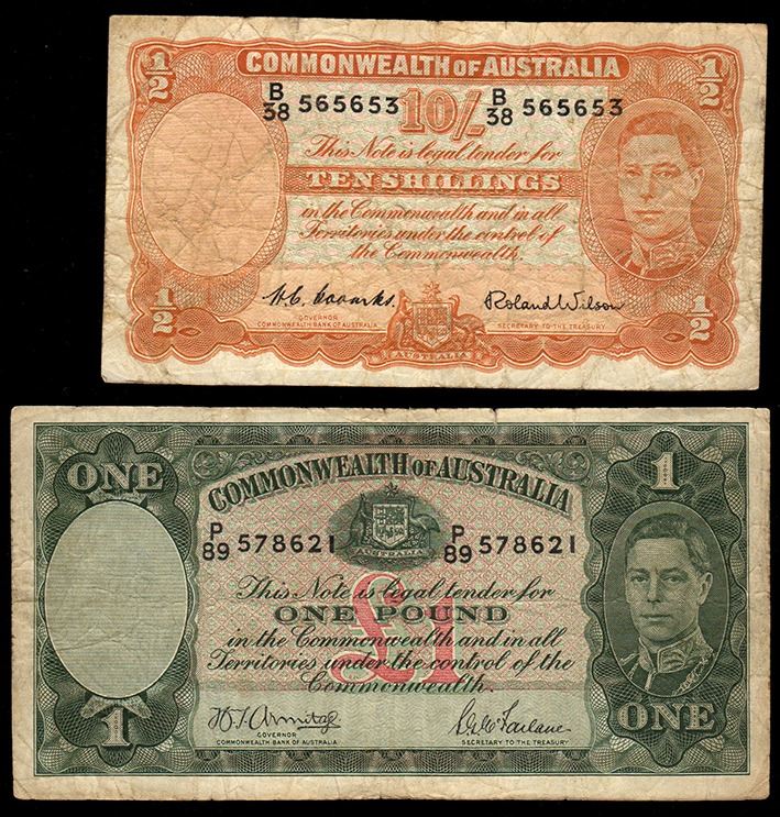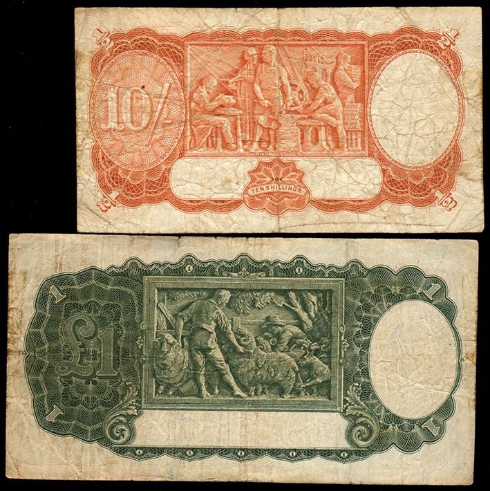 Ten shillings, Coombs/Wilson KGVI (R.15); One pound, Armitage/Macfarlane dark green (R.30a), fine with some tiny edge tears. (2)