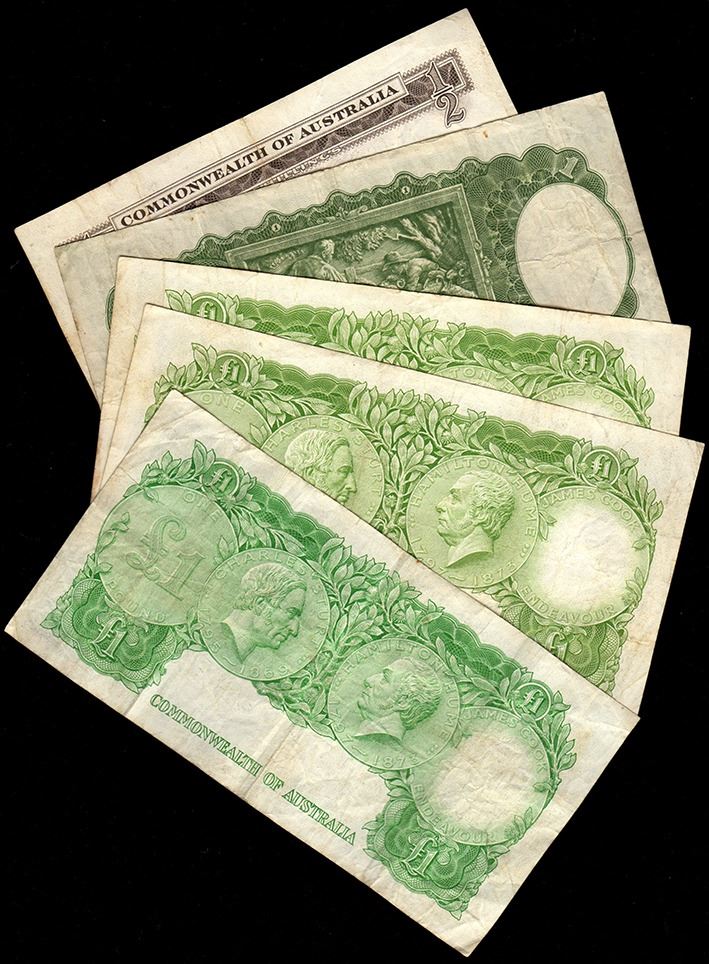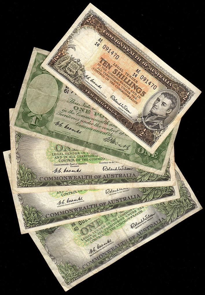 Ten shillings, Coombs/Wilson Commonwealth (R.16); One Pound, Coombs/Watt (R.31), Coombs/Wilson Commonwealth (R.33) Reserve dark green (R.34a) emerald green (R.34b), very good to good fine. (5)