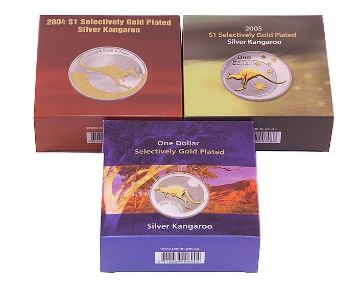Proof 1oz Silver One Dollar, Selectively Plated Kangaroos, 2004, 2005, 2006 (3 coins)