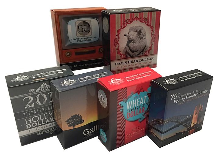 Proof Fine Silver Dollar, 2005 Gallipoli, 2006 Television, 2007 Sydney Harbour, 2011 Ram's Head, 2012 Wheat Sheaf, 2013 Holey Dollar & Dump (6 coins)