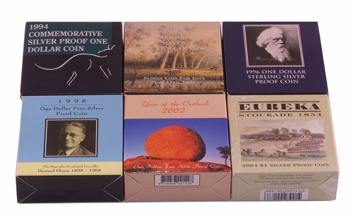 Proof Fine Silver Dollar Issues, 1994 Decade, 1995 Waltzing Matilda Coin Fair issue, 1996 Parks, 1998 Florey, 2002 Outback, 2004 Eureka Stockade (6 coins)
