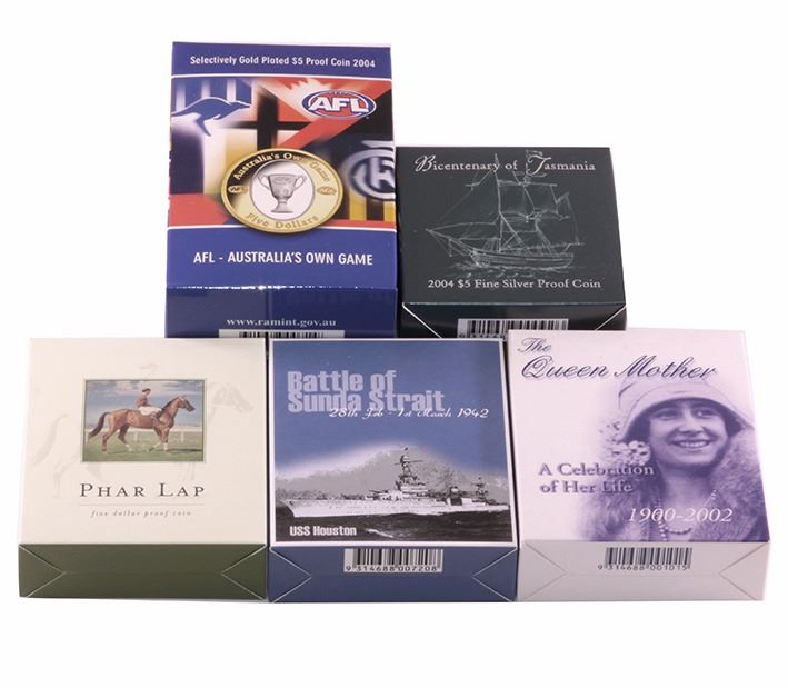 Proof Five Dollars, 2000 Phar Lap, 2002 Queen Mother, 2002 Sunda Strait, 2004 Bicentenary of Tasmania, 2004 AFL (5 coins)