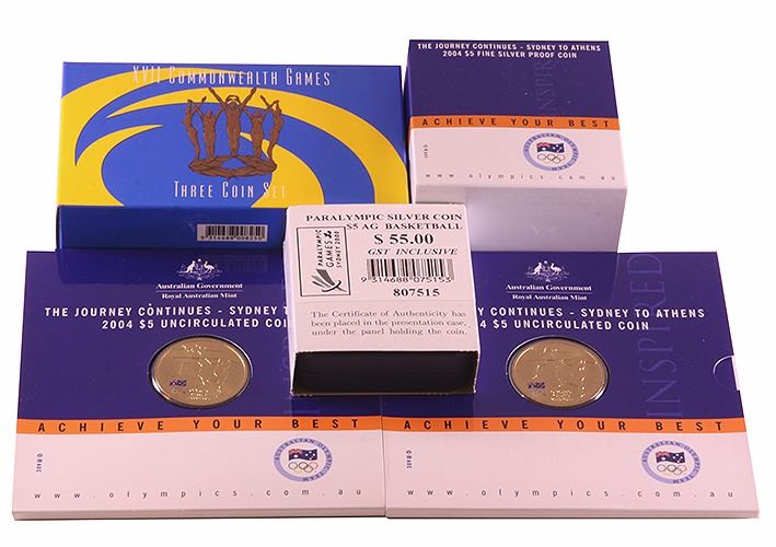 Proof Five Dollars, 2000 Paralympics, 2002 C'Wealth Games 3-Coin set, 2004 Sydney to Athens; plus Uncirculated Five Dollars, 2004 Sydney to Athens (2) (7 coins, 5 items)