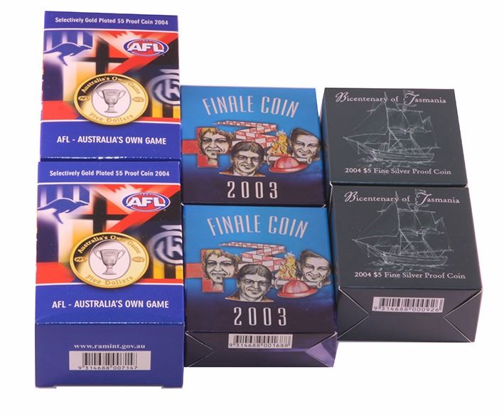 Proof Five Dollars, 2003 Finale Volunteers (2), 2004 Bicentenary of Tasmania (2), 2004 AFL (2) (6 coins)